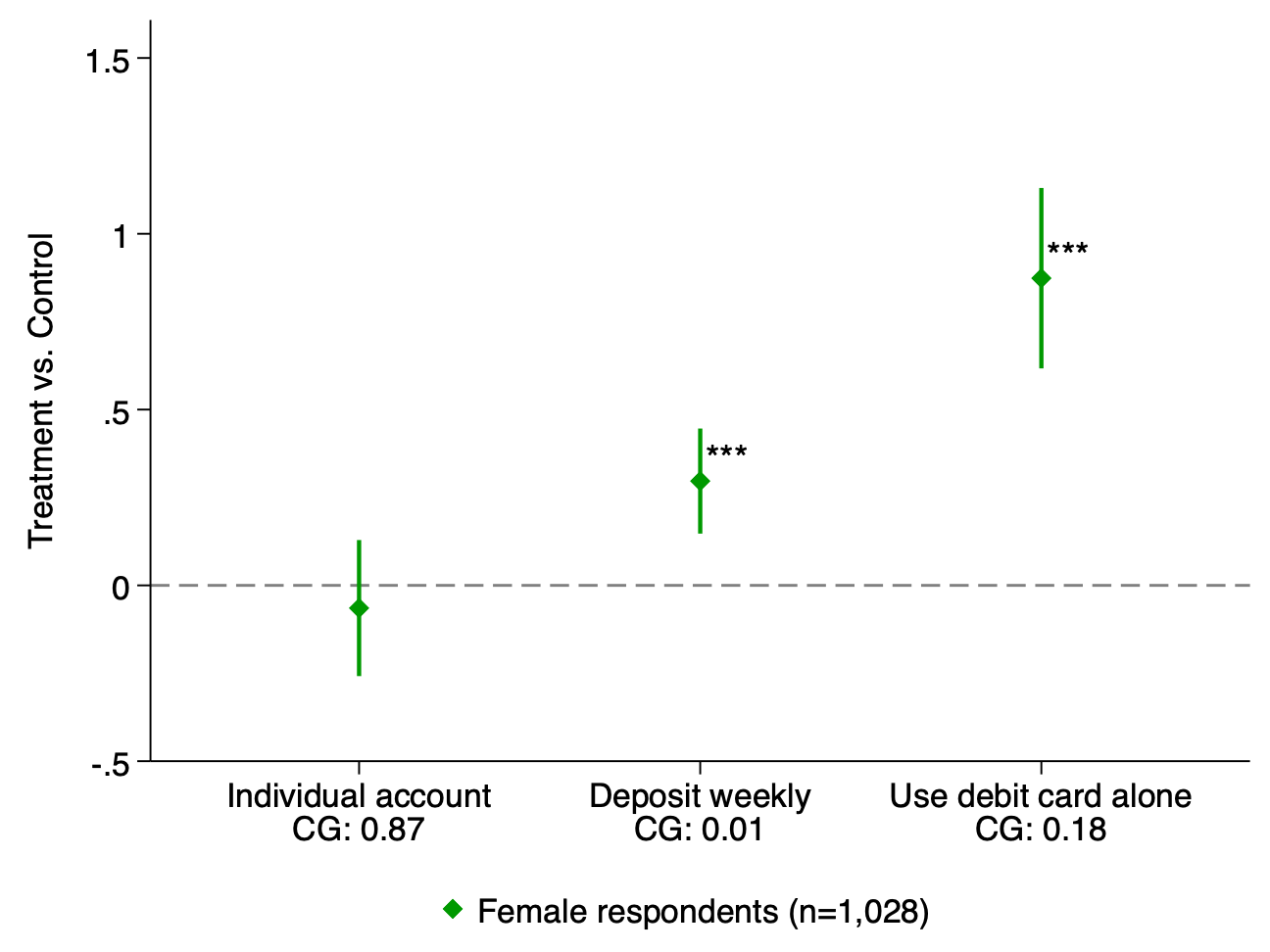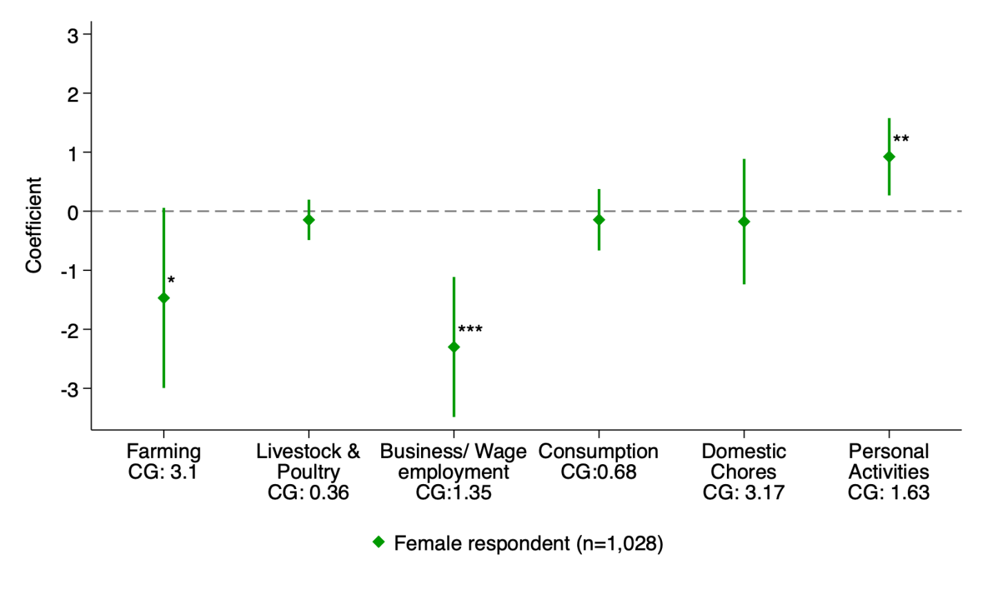 But for the most part they seem not to have spent the money on farming- they didn’t buy significantly more land, seeds, fertilizer, or farm equipment. They did spend more on “non-farm business equipment” and “large consumer durables”. Despite not producing more food themselves, they reported higher food security. Income stayed flat, but women were able to shift some time away from work and toward leisure: