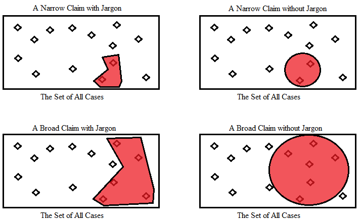 • The problem is that jargon has highly a specific meaning. So, when a specialist makes a claim with jargon, the claim is also specific. A narrower set of applicability has less room for credible challenges at the margins of a claim and ideas can be clearly communicated precisely – though, the applicable cases may not be interesting. As the breadth of a claim increases, jargon can help to ensure that the breadth is limited to appropriately specific cases.