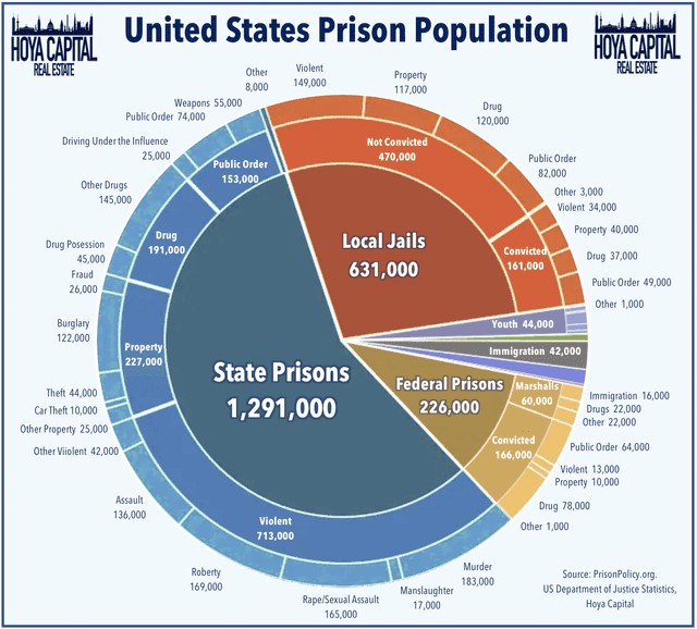 During some general reading on finance, I ran across the following two information-rich graphics from Hoya Capital on the U.S. prison population. On the first graph, the blue areas show the absolute numbers, and the green line shows the percent incarceration rate. A rate of 0.5% comes to 500 prisoners per 100,000 population.