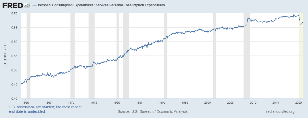 The problem with the exemption for services has been compounded over the years by the changing structure of the economy. Personal services were just 45% of personal consumption in 1959, but rose to 69% in 2020 (before the pandemic). This means that most states are excluding over 2/3 of their potential sales tax base!