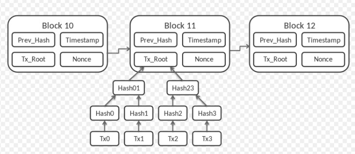 If Block 10 is the previous block in the blockchain, then the new, proposed Block 11 contains this Tx_Root, and several other numbers. The numbers shown here include a timestamp to establish the creation date/time for this block, the “hash” of all the numbers in the previous block, and a number called the “nonce”. (It’s not important for this level of discussion, but see here for a figure showing a complete list of all the numbers that go into a block).