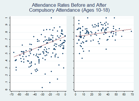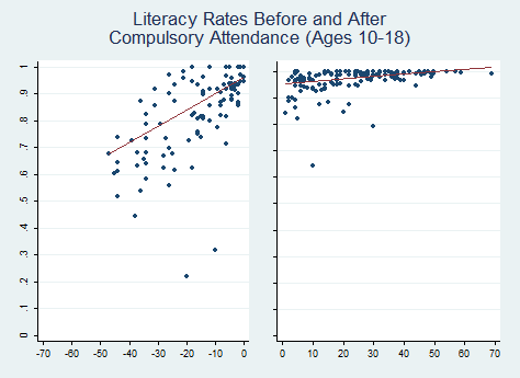 The hypothesis looks confirmed to me! So, what does this mean for us today? It means that the cost of a policy matters for its feasibility and how soon it will be enacted. We all have our pet policies that we’d like to happen now. But the graphs above illustrate that the policy is unlikely to be enacted until it’s almost not even needed anymore – or at least not needed by most. (As an aside, note that school attendance rates were lower than literacy rates. It seems that people either learned to read outside of school or only attended school long enough to get the basics.)