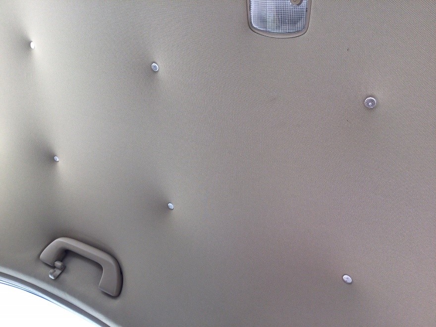 Or…you could use thumbtacks or other pins. I learned from these articles that above the fabric was a thin layer of fairly rigid foam insulation, which was attached to the underside of the metal car roof. Evidently, this foam would take a tack or pushpin. This approach seemed much easier than the other methods, but it seemed to me that simple tacks or pins would quickly work loose and fall out. But a couple of articles suggested using “twist pins” or “headliner pins”, where the metal pin is twisty like a corkscrew. They screw into the insulation and hold pretty well. So, I got a pack of twist pins with clear heads for $6 from Amazon, used some masking tape and a tape measure to get some symmetry in placement, and screwed them in. Another problem solved: