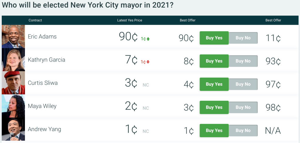 I say this not because I have scrutinized all the polls to predict the exact distribution of 2nd- and 3rd-place votes, or because I think I know more than Jeremy about political science or New York. Instead, any time I’m wondering about whether something will happen and I don’t have a strong opinion based on my own knowledge, I simply check what markets have to say. In this case, there are prediction markets bearing on this exact issue. The odds from PredictIt, shown below, have Adams (who finished with the most 1st-place votes, 32%) as the heavy favorite, with Yang reduced to an approximately 1% chance of winning.