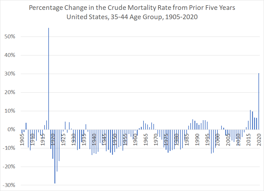 The second chart uses the same data to show the change in the crude mortality rate for this age group. I use the previous 5 years as the baseline. There’s not a particular reason to use 5 years, but whatever baseline you use you get the same result: the increase in mortality, even for those in “middle age,” is the largest single year increase since the 1918 pandemic: a 30% increase (1918 was 55%).