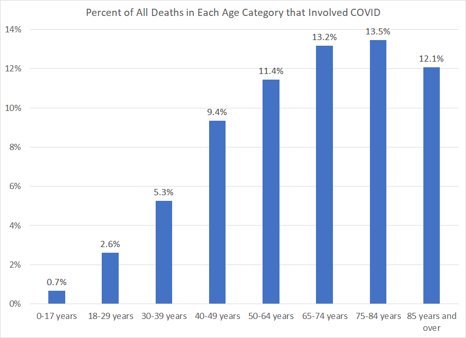 Here’s another way to think about: of all deaths in one age category, how many were COVID-involved deaths? The picture looks a lot different.