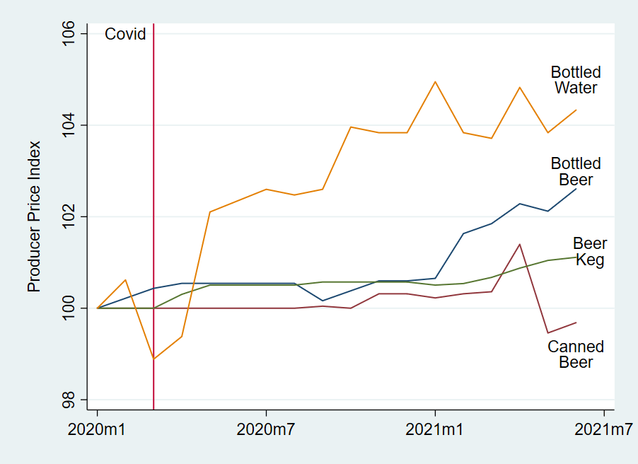 See the below graph. What kind of consumer are you? Since the start of the pandemic, canned, bottled, and kegged beer have all changed in price. Or maybe you’re a teetotaler and you’ve noticed the increasing price of bottled water. For interpretability, let’s consider what had cost $10 at the start of the year 2020. Bottled water has gone up to $10.50 and bottled beer has gone up to almost $10.30. You may not blink at a 3% price increase – unless it’s for 6 bottles of your favorite craft beer.