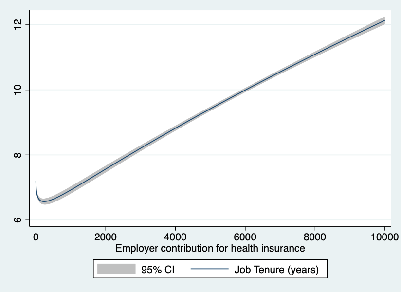 In an article published last week in Applied Economics Letters, my colleague Michael Mathes and I combine two supplements of the Current Population Survey to test whether employers who contribute more towards health insurance see their employees stay longer. Perhaps not surprisingly, we find that they do. We run lots of regressions to establish this, but this simple fit plot tells the story best: