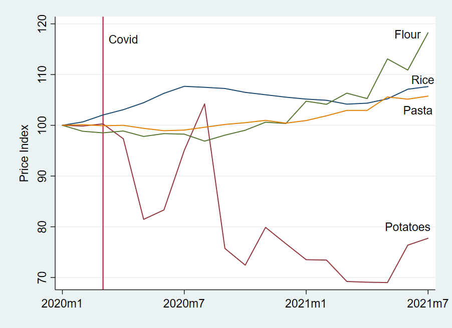 Good Call. These indices are from the PPI which measures the price that sellers receive. If there were retail disruptions due to the quickly changing composition of flour demand, then that would show up more in the retail rather than the producer prices. As we know, Covid introduced transportation and logistical disruptions. Greater transaction costs creates a wedge between what consumers pay and what producers receive. While sensible, IDK the reason in particular.