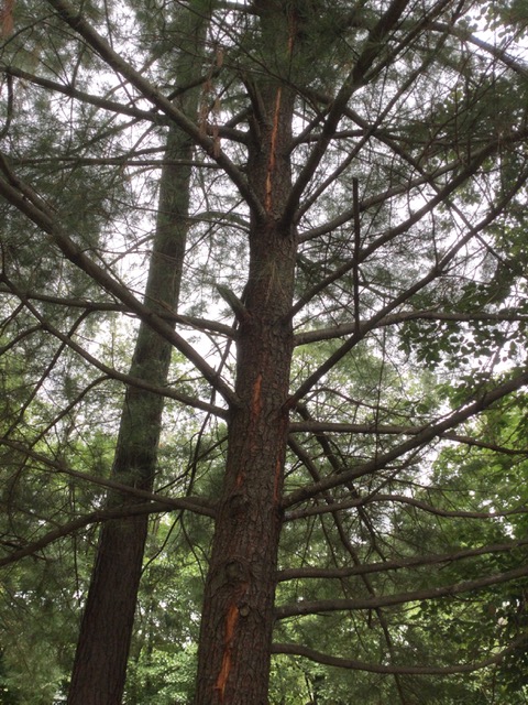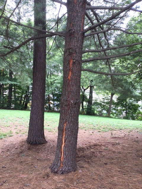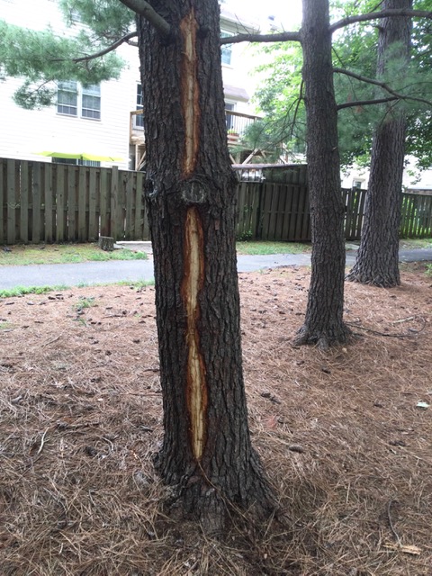 Later, we saw long vertical rips in the bark of a pine tree right beside our row of houses. I’ll share photos below. Here is what we see from the house side. There are vertical rips in the bark near the base of the tree, and also visible going up about 30 feet to a fork in the trunk. I could not see any marks or broken branches above that.