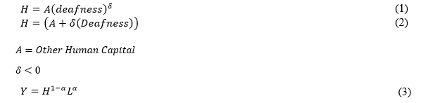 After receiving some great advice, I specified how deafness might affect human capital. There are two alternatives. (1) Asserts that deafness augments all other human capital. (2) Asserts that deafness is a subtraction from the stock of homogeneous human capital. Nicely, plugging either H into a simple production function (3) yields a marginal product of labor which is lower for the deaf.