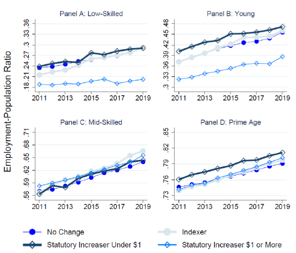We divide states into four groups designed to track several plausibly relevant differences in their minimum wage regimes. The first group consists of states that enacted no minimum wage changes between January 2013 and the later years of our sample. The second group consists of states that enacted minimum wage changes due to prior legislation that calls for indexing the minimum wage for inflation. The third and fourth groups consist of states that have enacted minimum wage changes through relatively recent legislation. We divide the latter set of states into two groups based on the size of their minimum wage changes and based on how early in our sample they passed the underlying legislation.