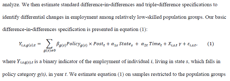 The coefficient 𝛽g(s) is an estimate of the causal effect of states’ minimum wage policy changes on employment… The key assumption is that employment among low-skilled individuals would, in the absence of the minimum wage changes we analyze, have evolved similarly across the various groups of states.