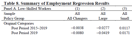 The regression model allows for those features to be incorporated as controls. Table 8 shows, “estimates of the change in the employment rate among individuals in our analysis samples from states that increased their minimum wages relative to individuals in states that did not increase their minimum wages.”