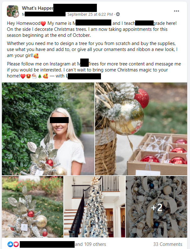 Creating holiday magic is a wonderful thing. There are huge positive externalities to even a simple string of lights around your front door. I love it. Creating the magic is also a lot of work. As someone who is forever swamped at work and has already booked three weekend work trips for Fall 2021, my willingness to pay for this service is positive. (I can’t afford this particular service, nor do I need my Christmas tree to look like the one in her picture.)
