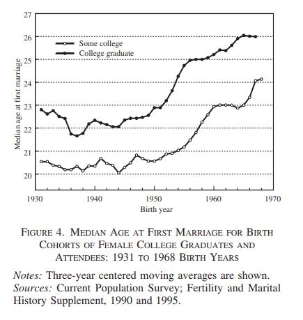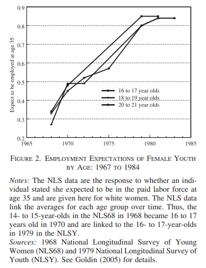 Notice that in 1967, less than 1/3 of young women expected they would by employed at age 35. But just a few year later by the late 1970s, over 80% of young women expected to be employed at age 35. This is certainly a dramatic change in expectations! But it’s also an extremely important change. If a young woman doesn’t expect to be employed at age 35, what will she do? She will spend most of her time looking for a husband. On the other hand, if she does expect to be employed, she will focus on her education, how that education will lead to a career, and starting out that career.