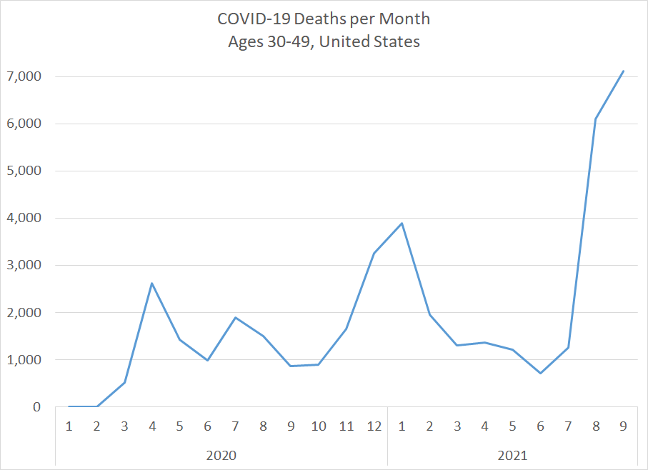 I would say absolutely yes. In the 12 months from October 2020 through September 2021, there have been 30,746 COVID deaths among the 30-49 age group, and a total of 37,205 respiratory deaths in total over this time period (including pneumonia and flu). First, we can compare this to a typical year. For the time period from 2009-2019, this age group typically had 5,000-6,000 respiratory deaths of all kinds, with 7,000 being the high (in 2009). So the number of respiratory deaths is something like 5-7 times a normal year.