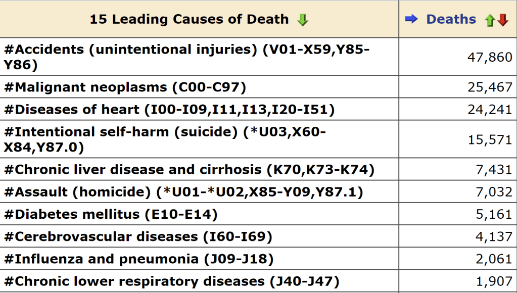 And what of all causes of death? For the 30-49 age group, the following table shows the leading causes of death for 2019. COVID deaths are easily the number two cause of death for this group given the past 12 months of data. It could even rival the top cause, accidents, if the next few months are as bad as Summer 2021 (deaths have fallen lately, which is great). We care a lot socially about automobile accidents, suicide, and murder (cancer and heart disease too, which typically aren’t thought to afflict this age group). We strongly encourage people to take steps (both small and large ones) to lower the risk of theses deaths. The case for encouraging vaccinations is strong, both compared to the risks of COVID and how deadly it is for this age group compared with other causes of death.