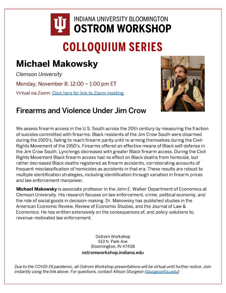 I’ll be giving a presentation today at 12pm ET over Zoom for the Ostrom Workshop Colloquium Series at Indiana University. It is my understanding that it is open to the public. The format is different than your typical economics seminar. I will give an introduction and brief summary of the paper for 20 minutes followed by questions.