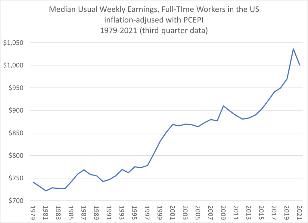 As we can see here, 2021 has the highest inflation-adjusted wages in the entire series, with the lone exception of 2020. As you probably already know, 2020 was a weird year for lots of data. 2021 is still weird, but probably less weird than 2020. For the wage data, the biggest issue is that many jobs were lost at the bottom of the pay scale in the US, so the median wage of those that still had jobs was artificially increased. We’re still not back to full employment at this point in 2021, but we’re a lot closer than last year.