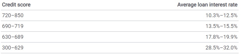 Are these high rates a red flag for lending to seedy, high-risk consumers? Well, not as much as I thought. It turns out the rates on generic, unsecured personal loans are just plain high. Here is a table from Holly Johnson at bankrate.com, showing typical loan rates for various credit scores: