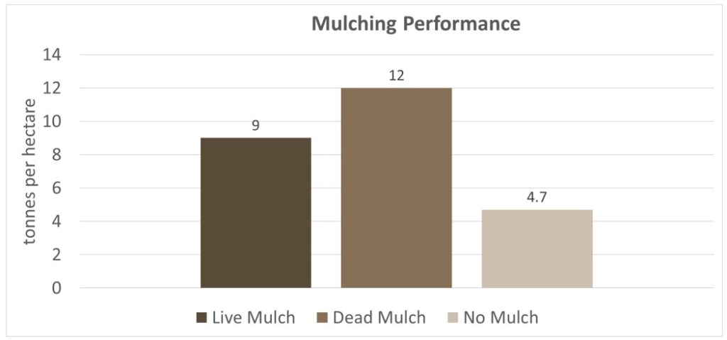 These results highlight the importance of providing sufficient mulch, which may require stockpiling plant material and (for large fields) growing cover crops. For farming larger fields, mechanized roller crimpers can convert cover crops into mulch, and no-till seed drills can quickly plant seeds though a mulch layer without disturbing it.