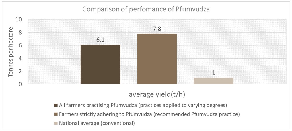 Preliminary calculations based on the yield performance of the pilot Pfumvudza plots under the [FAO pilot] programme revealed that for every British Pound that the programme invested in extension and advisory services towards the Pfumvudza model, the incremental value of the grain produced is £9.2. In other words an investment of £1 produced outputs worth £9.2. The incremental production alone can provide enough grain for almost four months for a family of six. Thus Pfumvudza is not only very effective in addressing food insecurity but also provides the most efficient way of utilizing resources in the fight against hunger and indeed poverty.
