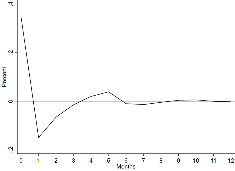 How do we interpret this result? Well, an unexpected shock to the price level will result in, on average, continuing price increases, albeit at a decreasing rate. This is not so informative however. Of course we would see this pattern on average in the US. Prices have being rising for a long time and this particular data reaches back all the way to 1959. So, yes, surprise price increases have always been followed by more increases in the price level.