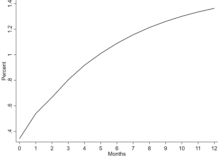 First, let’s say that PCE price index rises unexpectedly. Here we’ll define ‘expected’ as the change that’s predicted by the last 4 months of price data. So, if there is a shock to prices, then the VAR can tell us what pattern the price level will follow on average. Essentially, it allows people have a ‘normal’ time expectation and a different expectations for when their expectation was wrong. They can say to themselves, “I’ve been wrong before. What happened the last time that I was wrong?”. Below is the effect on price after a 1 standard deviation shock to the price level.