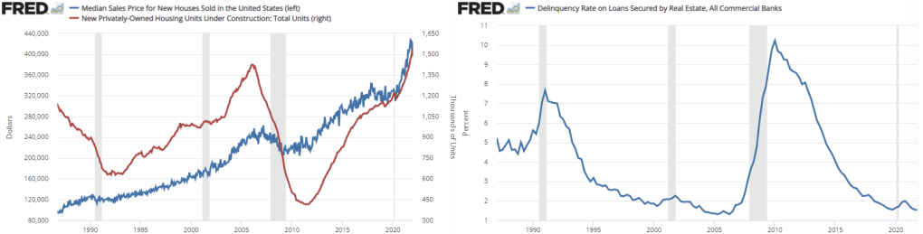 One can speculate. What kind of bubble do I mean? New units under construction has been convex for the past two years. When it began declining from its previous peak in January of 2006, new home prices didn’t begin falling until 15 months later in April of 2007. Regardless, we’re at neither a construction nor a price peak currently. Notice that units under construction declines and real estate-backed loan delinquency rise prior to recessions and median housing price declines.
