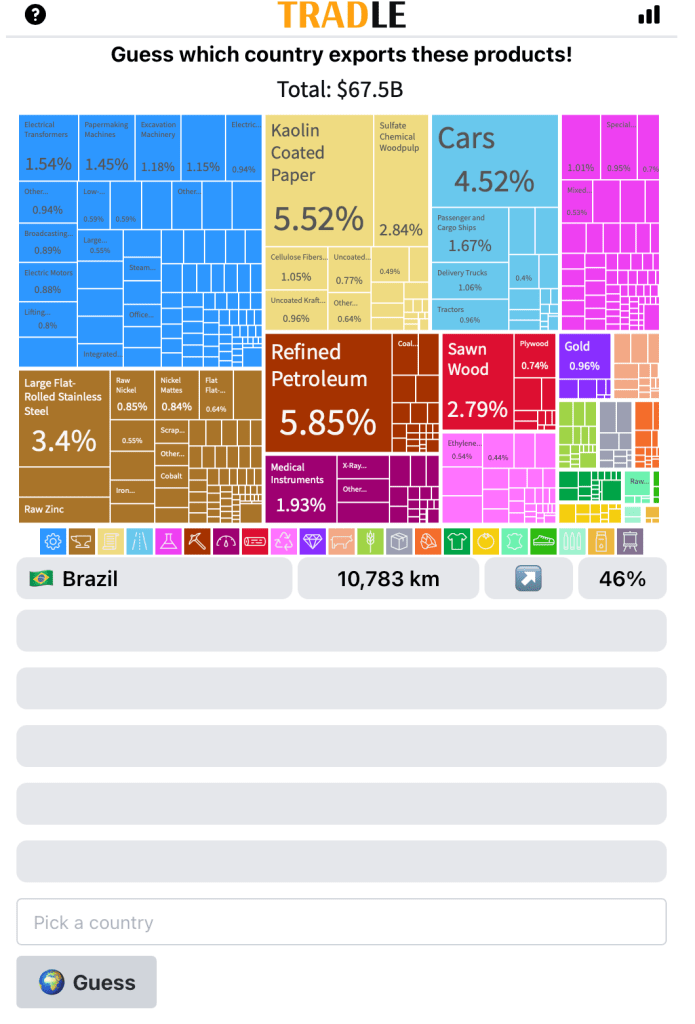 The success of Wordle has inspired a host of similar games. My personal favorite is Worldle, where you guess a country based on its shape. But the one that’s most econ-relevant and the one that I learn the most from is Tradle. You have to guess the country based on its exports: