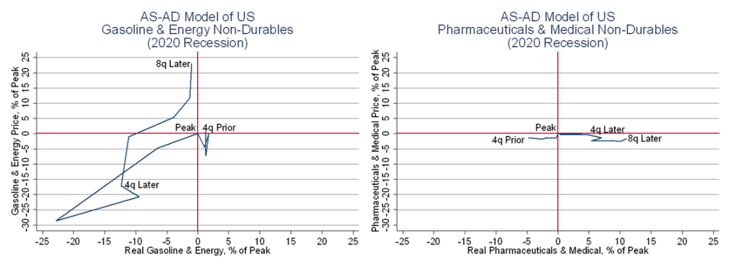 Below are the Aggregate Supply – Aggregate Demand graphs for Food & Beverages and Clothing & Shoes. The former is for foods and beverages consumed off of the premises (so not restaurants). Since the pre-recession peak, total demand for food increased by 22% (that’s 22% over *two* years!). Except for a small hiccup in Q4 of 2020, the quantity of food purchased never fell during the pandemic and prices were constant for the first three quarters. Between 4 and 8 quarters after the pre-recession peak, food prices rose nearly 9.3%. AD increased for food with nary a supply disruption.