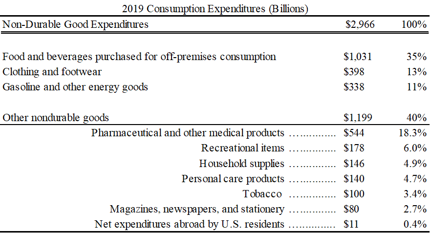 Even though it’s not the largest category, many people think of non-durables when they think of consumption. Below is the break-down of non-durable spending in 2019. The largest singular category of non-durable spending was for food and beverages, followed by pharmaceuticals & medical products, clothing & shoes, and gasoline and other energy goods. Clearly, the larger the proportion that each of these items composes of an individual household budget, the more significant the welfare implications of price changes.