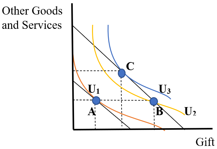Given some gift budget, a gift giver possessing complete information and a recipient possessing perfect information would always purchase the receiver’s utility maximizing gift, regardless of who does the job of purchasing the gift. That occurs at point C below.