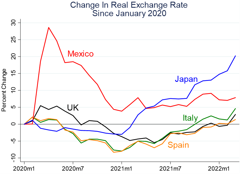 One way to think about how much you can afford is to consider the different rates of inflation experienced by your potential vacation destinations. Say that you were on the fence between visiting Edinburgh and Tokyo. After all, if the price level rose by 10% in the United Kingdom since January 2020 and prices rose in Japan by 5%, then you might think that Japan is now the better option (James Bailey and Jeremy Horpedahl have compared international inflation rates recently).