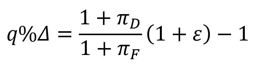 Where π is the domestic or foreign rate of inflation, and ε is the percent change in the exchange rate. The equation yields how much more we can afford in percentage terms. The bigger that number, the more you can afford to travel abroad than you could previously (relative to a staycation).