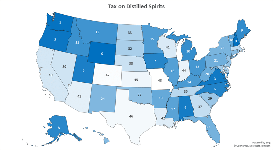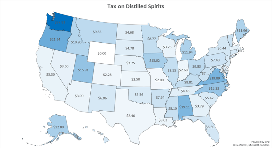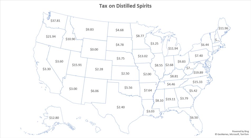 All of these features are fun to play with and will get the job done. But, the Excel Map tool is still in its early stages. There is an limited amount of visual format flexibility. But the data capabilities and labeling functionality fall flat.  Regardless, I strongly recommend this tool for students, teachers, policy analysts, and for arguments on the internet. So long as you understand and accept the limitations, you won’t get too frustrated. Personally, I think that the gold standard for mapping data is set by the Tax foundation. Their maps are informative, detailed, and accommodating. All of the state liquor tax data is from them. You can see their much map using 2021 data below.