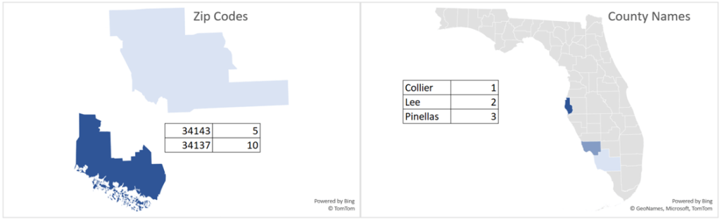 The Map function in Excel is pretty cool. You don’t just have to list states. You can also list countries, provinces, counties, and zip codes. Excel uses Bing, which is pretty smart and can recognize context clues. I typed the below bare-bones data tables and it recognized what I wanted without issue. Excel will do its best to show the relevant universe by default, such as whether to display the state, country, region, or world. But you can also adjust the settings to show only areas with data, such as in the below map on the left.