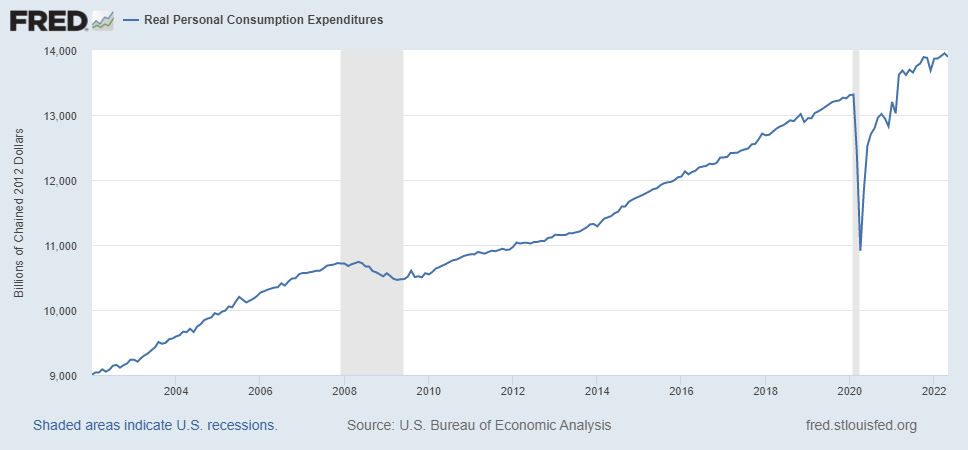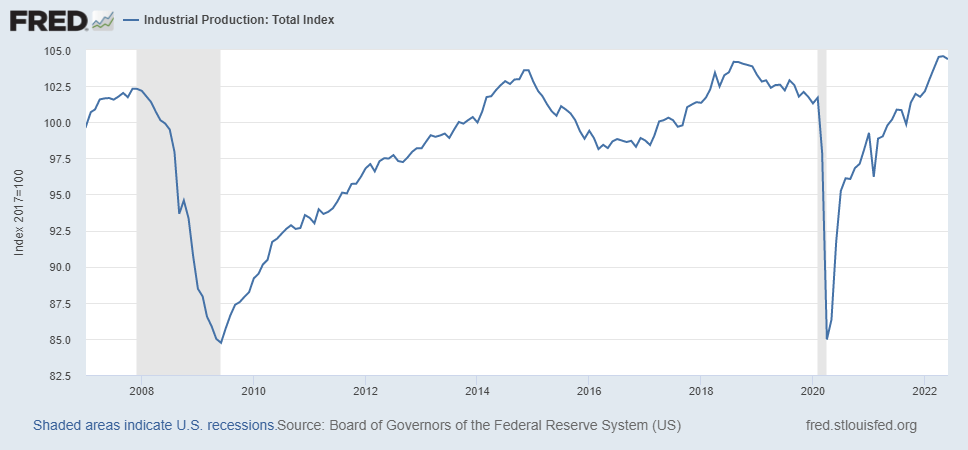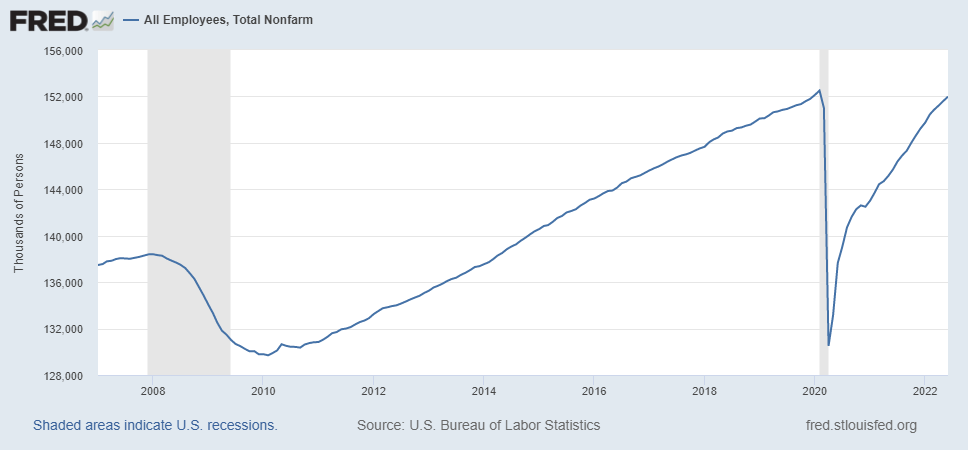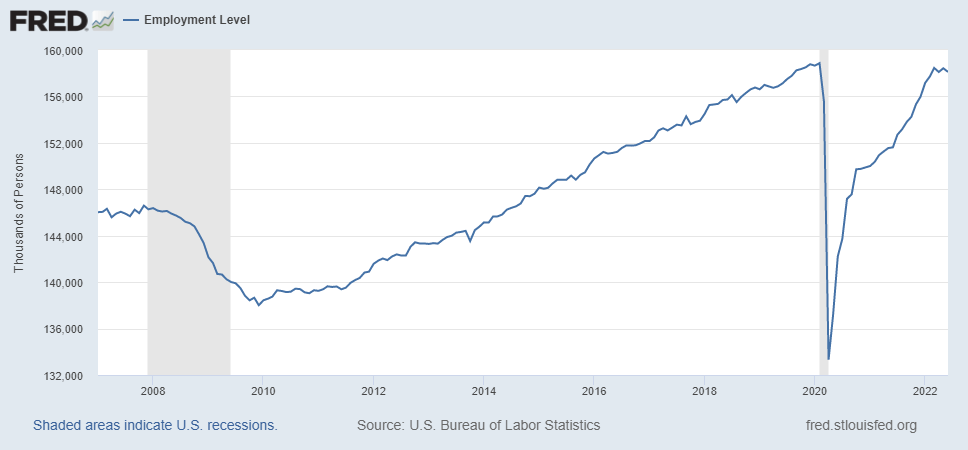 However, the American public seems convinced that we are in a recession. The most recent poll I can find on this is from mid-June, which is useful because (as we’ll see below) we have most of the relevant measures of the economy for June 2022 already. In that poll, 56% of Americans say we are in a recession. And while there is some partisan bent to the responses, even 45% of Democrats seem to think we are in a recession. For those that say we are in a recession, 2/3 cite inflation as the primary indicator that we are in a recession.