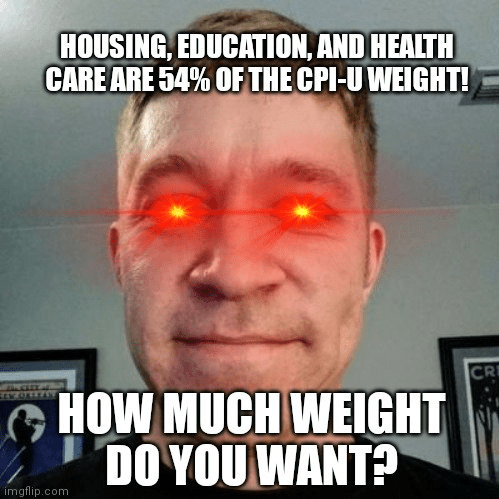 But… that’s only for goods. What about services? What about a very specific kind of good: housing? Services constitution about 2/3 of all consumer spending in the US today. And that’s not a recent change: they have been over half of consumer spending since 1970. And depending on how you count it, housing expenditures are somewhere between 35 and 40% of consumer spending. We can’t ignore these! I take this issue so seriously on Twitter, I’ve even been turned into a meme.