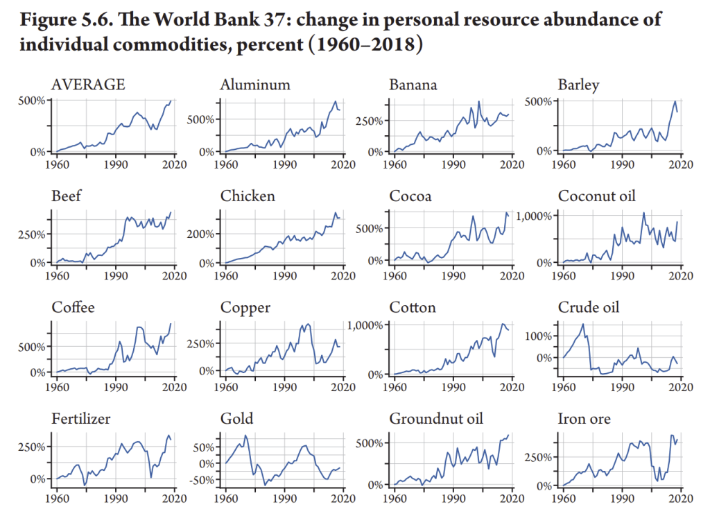 That much is true for goods. And I believe this book really puts to rest the idea that we are running out of resources, either natural resources or agricultural land to grow food, in any important way. Julian Simon spent a good part of his career trying to show this in various ways, but Tupy and Pooley have really shown us all the data, from multiple directions, in a way that is clear to understand. Resources aren’t only becoming more abundant, they are becoming superabundant. To just take a few examples, since 1960 the global “time price” o rubber, tea, tobacco, palm oil, coffee, and cotton all fell by 90% or more! (They use global GDP per hour worked as the “wage” in this example). And on average commodities fell in “time price” by 83%, meaning that the typical worker could double their consumption of commodities every 22 years. World population has grown from 3 billion to almost 8 billion since 1960, yet resources became massively cheaper.