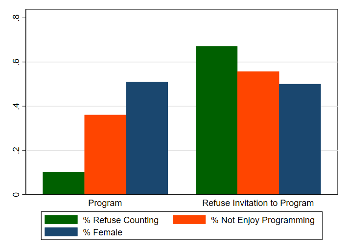 I’ll discuss the three features in this graph in what appear to be the order of importance for predicting whether someone wants to program. There was an enormous difference in the percent of people who were willing to return for an easy tedious task that I call Counting. By inviting all of these subjects to return to count at the same hourly rate as the programming job, I got a rough measure of their opportunity cost of time. Someone with a high opportunity cost of time is less likely to take me up on the programming job. This might seem very predictable, but this is a large part of the reason why more Americans are not going into tech.