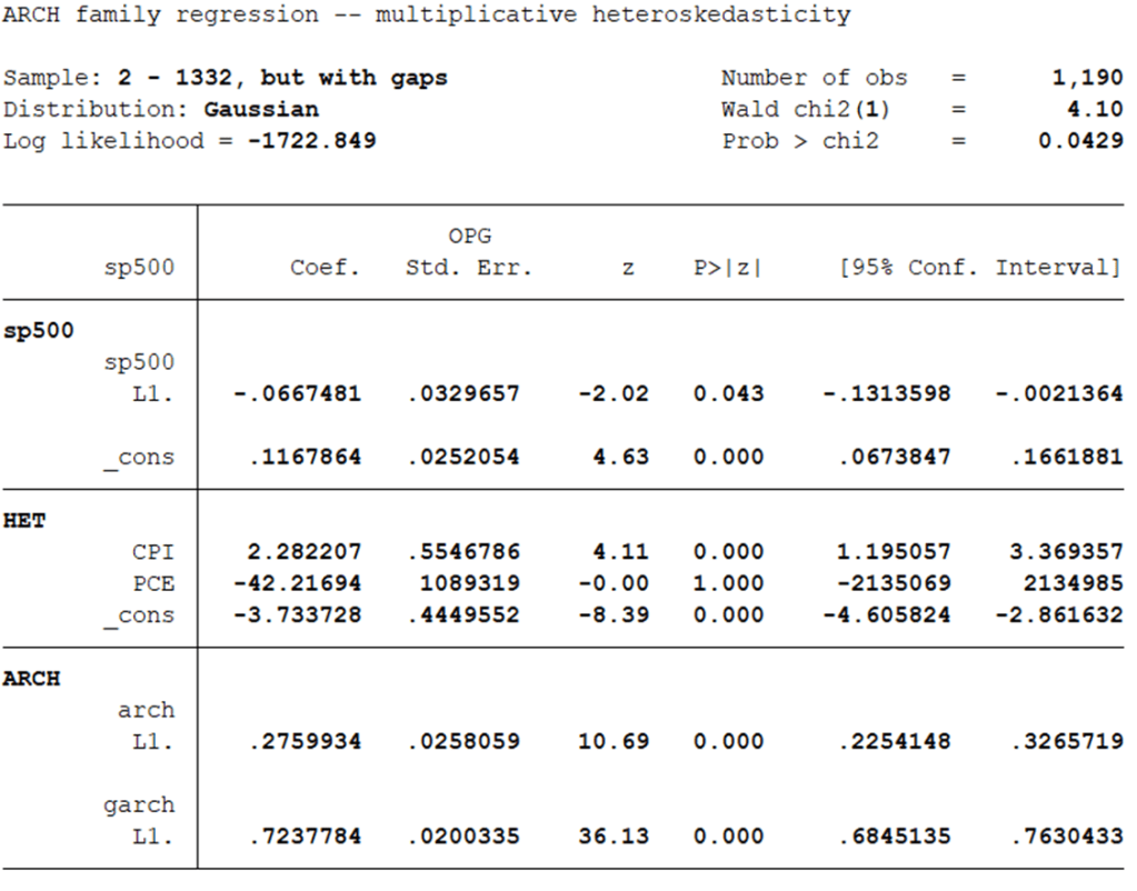 I won’t bore your with the details, but the bottom line is that we can specify variables that we think cause volatility (interested folks can read page 13 of the stata entry for model specific info). Using an indicator variable for release dates, we should observe a more positive coefficient for CPI releases and a smaller coefficient for PCE releases when we try to model daily S&P returns. Below are the results for the past 5 years of data.