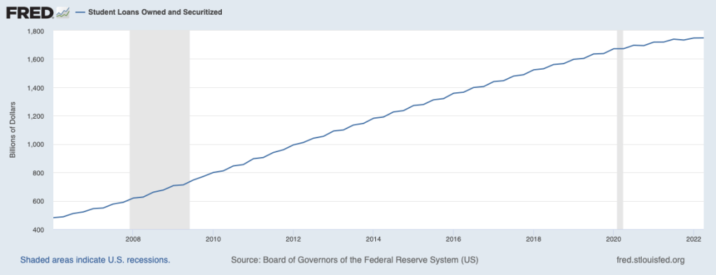 To the extent that you think student debt is a national problem, this action didn’t solve the problem so much as push it back 6 years; wiping out roughly 20% of all student debt brings us back to 2016 levels. So we could end up right back here in 2028, possibly faster to the extent that students borrow more as a result.
