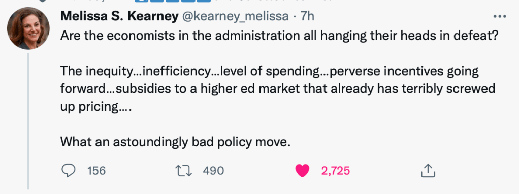 Yesterday the Biden administration announced that is forgiving up to $20k per person in student debt. So far we’ve seen lots of debate over whether this was a good/fair idea; as an economist who paid back his own debt early, you can probably guess what I have to say about that, so I’ll move on to the more interesting question of what happens now.