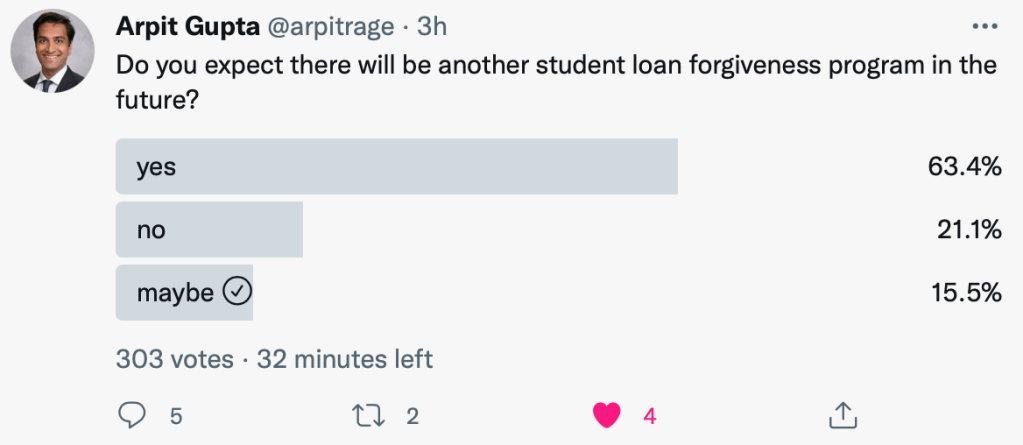 OK, what happens next? The big question is: is this a one-time thing, or does it make future loan forgiveness more or less likely? Later I’ll make the argument for why the answer could be “less”. But right now most people seem to think the answer is “more”, and that belief is what will be driving decisions.