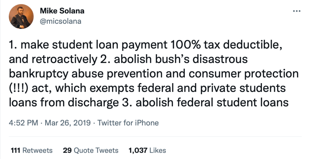More realistic will be limits on where Federal loan money can be spent, and shared responsibility for colleges. Colleges and the government have spent decades pushing 18 year olds to sign up for huge amounts of debt. While I’d certainly like to see 18-year-olds act more responsibly and “just say no” to the pushers, the institutions bear most of the blame here. The Department of Education should raise its standards and stop offering loans to programs with high default rates or bad student outcomes. This should include not just fly-by-night colleges, but sketchy masters degree programs at prestigious schools.