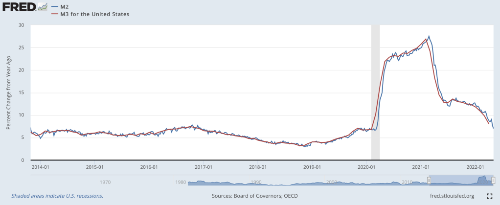 The other reason I’m optimistic is that the days of rapid money supply growth continue to get further behind us. From March to May 2020, the M2 and M3 supply exploded, growing at the fastest pace in at least 40 years: