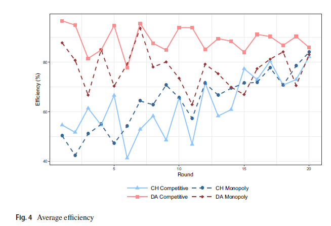 Figure 4 plots the average efficiency in each round in the four treatments. Efficiency is defined as the percentage of the maximum social surplus realized. … learning takes longer under the clearing house institution; hence, average efficiency under the clearing house institution presents a stronger upward trend over time. Under the clearing house institution, the average efficiencies start at levels lower than under the double auction institution, and remain statistically lower in the second half of the experiment. Nevertheless, we can observe from Fig. 4 that the upward trend of the efficiencies in clearing house treatments persist over time, and at the end of the experiment, the efficiency levels from the two institutions are close.