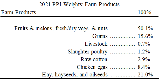A long-run driver of food prices are the costs that food producers face. The US Bureau of Labor Statistics divides the Producer Price Index into multiple categories that are relevant for a variety of sectors and points within the production process. Below is a table of the most fundamental, relatively unprocessed farm products and their weight among all farm products in December 2021. Cotton is a relatively large component for farm products even though it’s not a food and I include it for completeness. Fruits, veggies, and nuts makeup the overwhelming proportion of the cost of farm products. I was at first surprised that grains composed such a small proportion. But, being dirt cheap, it makes sense.